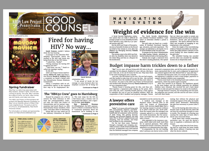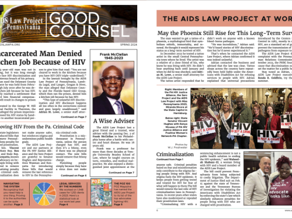 The AIDS Law Project provides free legal services to residents of Pennsylvania or Southern New Jersey who are living with HIV or vulnerable to acquiring HIV. Our office is open Monday-Friday. All calls to our office are answered live during intake hours (9:30 – 1 p.m.) and referred to an intake advocate for a call back on the same business day. Calls after intake hours are returned the next business day. Callers may reach us at 215-587-9377 or 267-520-0024. Requests for assistance may also be made online at: https://www.aidslawpa.org/on-line-intake.